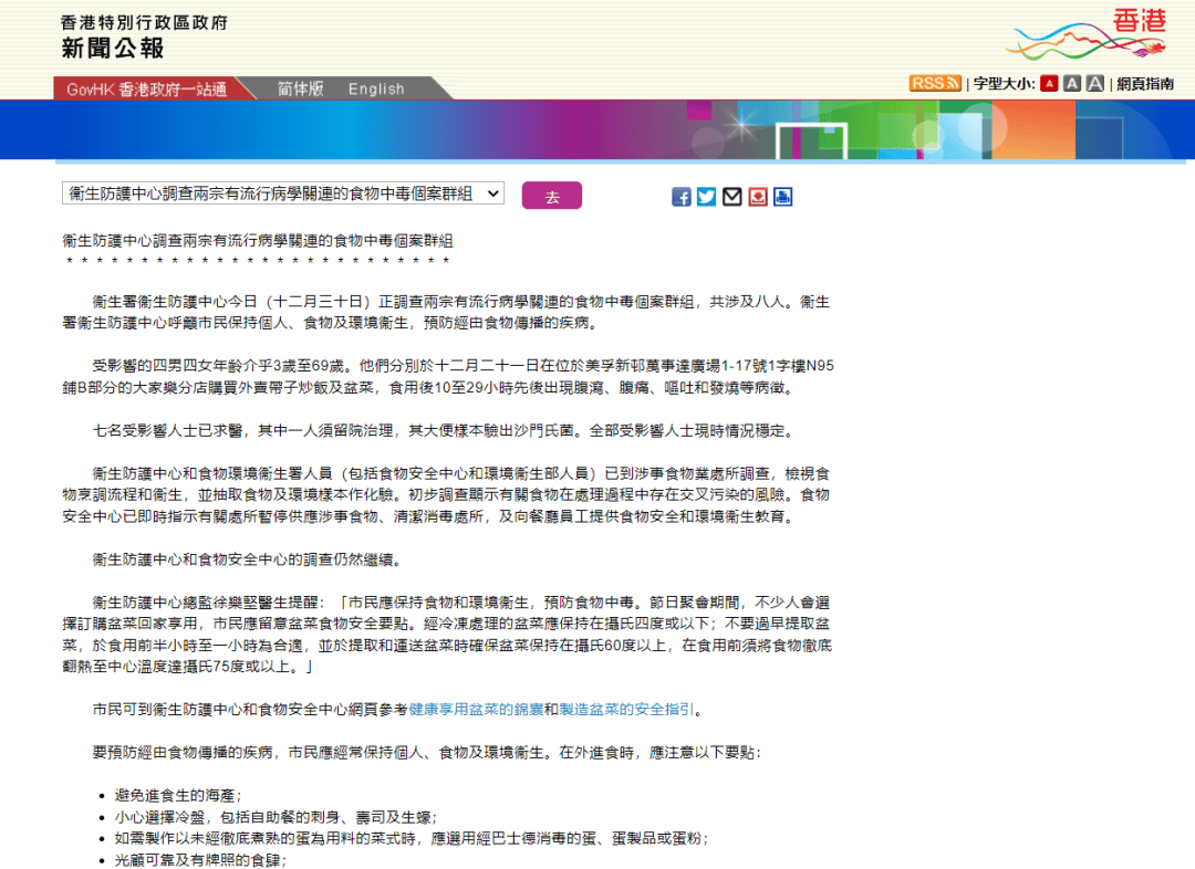 出名餐饮企业大师乐被传递,四男四女别离正在大师乐门店利用外卖带子炒饭及盆菜后,先后呈现腹泻等病症。此中,1人留院管理,其大便样本验出沙门氏菌。卫生署卫生防护核心称,已到涉事门店查询拜访,并抽取样本做化验,目前查询拜访仍然继续。对此,大师乐集团相关担任人向南都湾财社记者暗示,大师乐集团十分关心有顾客盆菜后呈现不适之思疑个案,并对受影响顾客暗示慰问。大师乐万事达广场分店已立即进行深层洁净取消毒,同时并沉申食物出产及制做流程,确保所有出品均合适集团的卫生尺度取。中国内地的大师乐所有餐品(包罗盆菜)均严酷遵照国度食物平安尺度,并正在内地出产取运营。近日,卫生署卫生防护核心传递称,正查询拜访两有风行病学联系关系的食物中毒个案群组,共涉及四男四女,春秋介乎3岁-69岁,他们别离于2025年12月21日正在位于美孚新邨万事达广场的大师乐分店采办外卖带子炒饭及盆菜,腹痛、和发烧等病征。卫生署卫生防护核心暗示,此中7名受影响人士已求医,此中1人须留院管理,其大便样本验出沙门氏菌。全数受影响人士现时环境不变。该核心指出,相关部分已到涉事食物业处所查询拜访,食物烹饪流程和卫生,初步查询拜访显示相关食物正在处置过程中存正在交叉污染的风险。食物平安核心已及时相关处所暂停供应涉事食物、洁净消毒处所,及向餐厅员工供给食物平安和卫生教育。目前查询拜访仍然继续。
