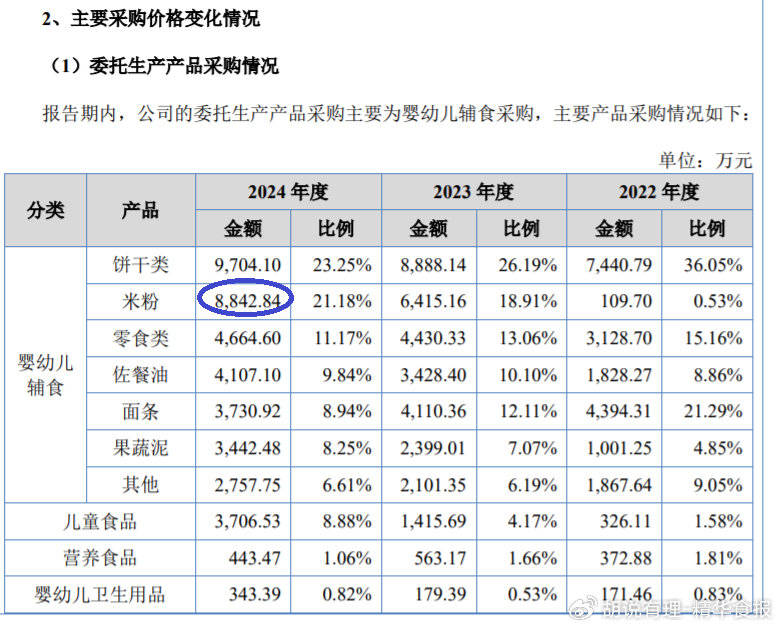 英氏本年向北交所提交的公开让渡仿单发布了2022年-2024年财政相关环境,其营收别离为 12。96 亿元、17。58亿 元和 19。74亿元,连结较快增加。但英氏并未发布委托代工产物收入占营收比沉环境,仅发布了代工产物的采购量、采购金额等相关消息。不外以上述两份公开让渡仿单中都提到的2022年数据为例可大致估算:2022年英氏代工产物采购额2。0641亿元;营收6。957亿元,占营收53。68%。按此推算,若是不考虑采购金额涨跌等问题,英氏2024年代工产物收入该当跨越10亿元。值得留意的是,2024年英氏委托加工产物采购总金额为4。17亿元,此中饼干类采购金额9704。1万元,位居采购金额第一位。排名第二的就是委托出产的米粉营业,采购金额为8842。84元(不含税)。