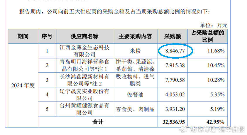 正在英氏的五大供应商里,位居第一位的也恰是米粉代工场江西金薄金生态科技无限公司,只是令人迷惑的是,英氏发布2024年向该代工场采购米粉金额为8846。77万元(不含税)。明显这一数据取上述8842。84万元并非分歧。