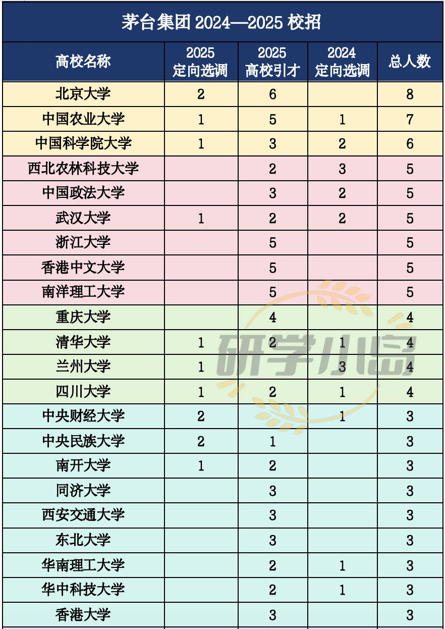 2025年上半年,茅台集团停业总收入910。94亿元;归母净利润454。03亿元,相当于日赔约2。5亿元!贵州省定向选调将省属企事业单元插手进来,除了定向选调外,茅台集团于2025年还了高校引才打算,招录134人,年总包不低于40万、购房补助不低于50万、七险二金、带薪休假,而且供给人才公寓!我们先来看看茅台集团2024取2025定向选调、2025高校引才总录用人数,大学、中国农业大学、中国科学院大学位居前3,别离有8人、7人、6人被录用。西北农林科技大学、中国大学、武汉大学、浙江大学、南洋理工大学,均有5论理学生被录用。从录用高校人数来看,文理医型大学、农业大学、财经大学全体录用人数靠前。中国农业大学、西北农林科技大学的酿酒工程实力都很强,西北农林科技大学的葡萄酒学、葡萄酒工程学等更是全国第1。